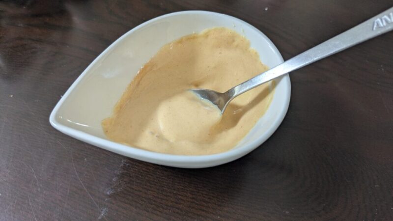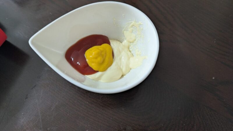 マヨネーズ:ケチャップ=1:1、そしてマスタードを小さじ1ぐらいです。