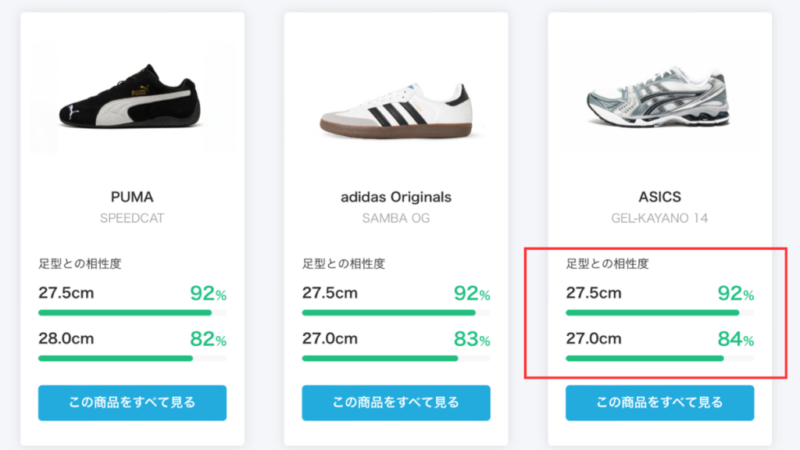 もしかするとZOZOMATの相性度は、小さ過ぎるというクレームが起きないようにちょっと大きめを推奨しているのかもしれませんね。