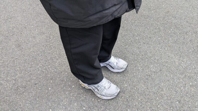 いざ履き始めてみると、典型的な日本人足の筆者にとってはこれ以上ないフィット感と歩きやすさを感じています。アシックスというと、我々40代世代には「子供時代に履かされていた体育館シューズ」のイメージが強いと思いますが、このゲルカヤノはメタリックパーツと流線型のフォルムが散りばめられていて近未来的なテック感があるので、履くだけでこなれ感が出て、全身黒コーデの足元のハズしとして面白いです。