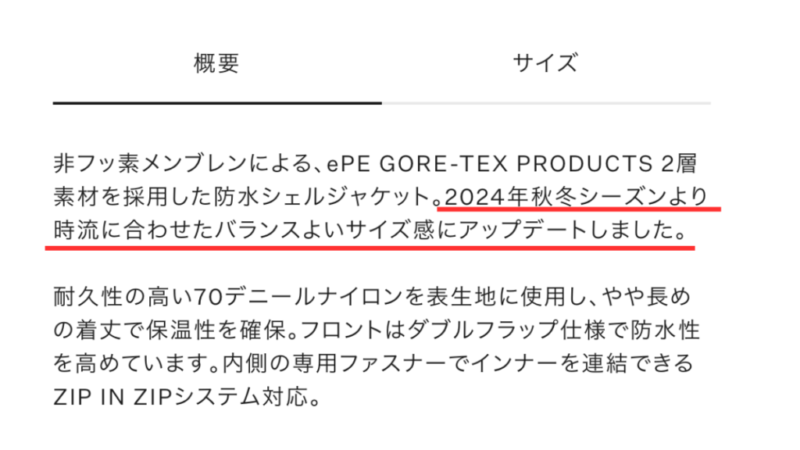 ノースフェイス公式オンラインの2025年秋冬モデルの商品説明欄を確認すると、「2024年秋冬シーズンよりサイズ感がアップデートされた」という説明のみでした。