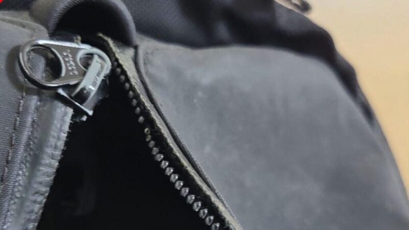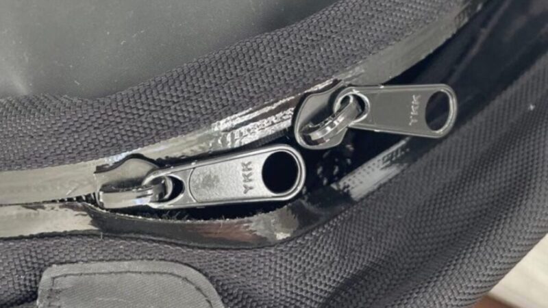 - 止水ファスナーの故障: ウェアと同じようにバッグでもよく使われている止水ファスナーは見た目はスタイリッシュですが、ゴム状のパーツが経年劣化で割れたり、開閉の負荷でファスナーレールから外れたりするトラブルが多いのが現状です。