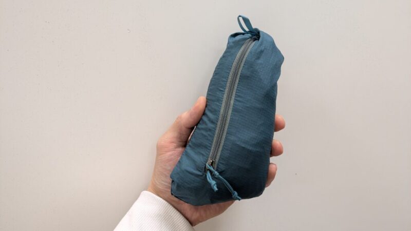 スタッフサックだと持ってくるの忘れたとか失くす心配がありますが、胸ポケットに直接収納できるので安心ですよね。